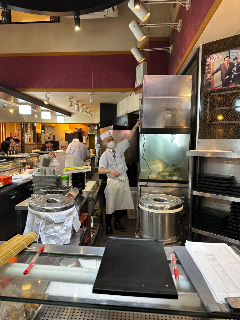 7 AM at a 24-hour sushi place. The master is fishing a Spanish mackerel out that he will serve as sashimi – freshly cut